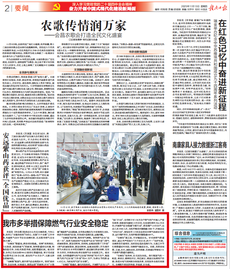 11月13日,《赣南日报》今日刊发《我市多举措保障燃气行业安全稳定》。