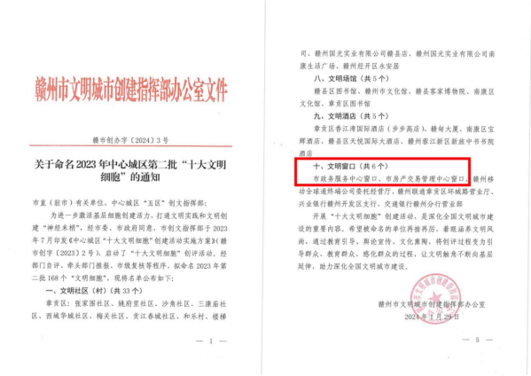 近期,赣州市文明城市创建指挥部办公室印发了《关于命名2023年中心城区第二批“十大文明细胞”的通知,赣州市房地产交易管理中心被命名为“文明窗口”。