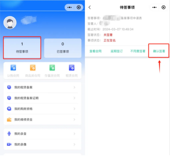 购房人通过手机微信搜索【赣州住建便民】小程序,经人脸识别登录后,在【待签事项】中找到本人须办理的业务点击【确认签署】按钮进行签署。