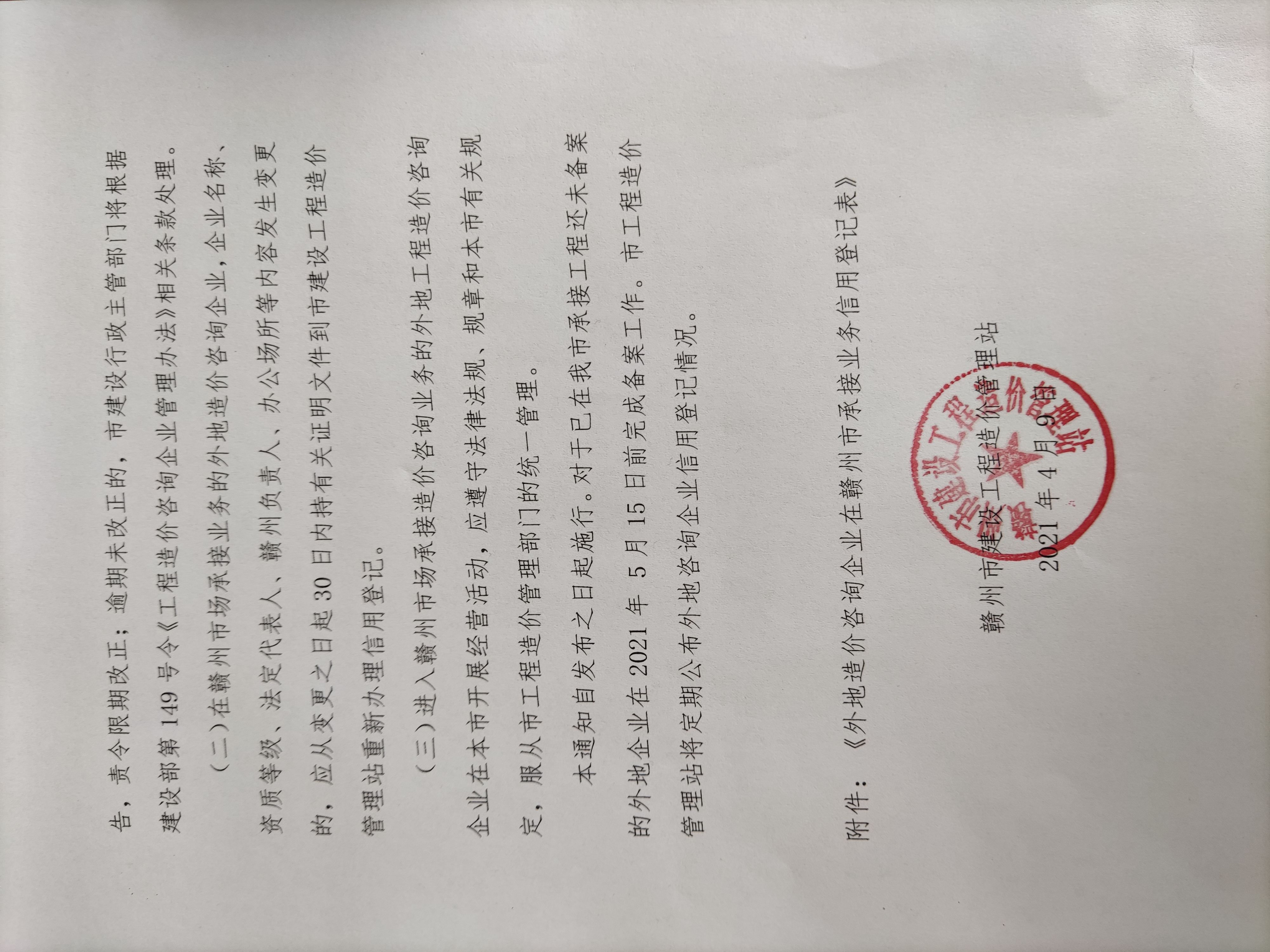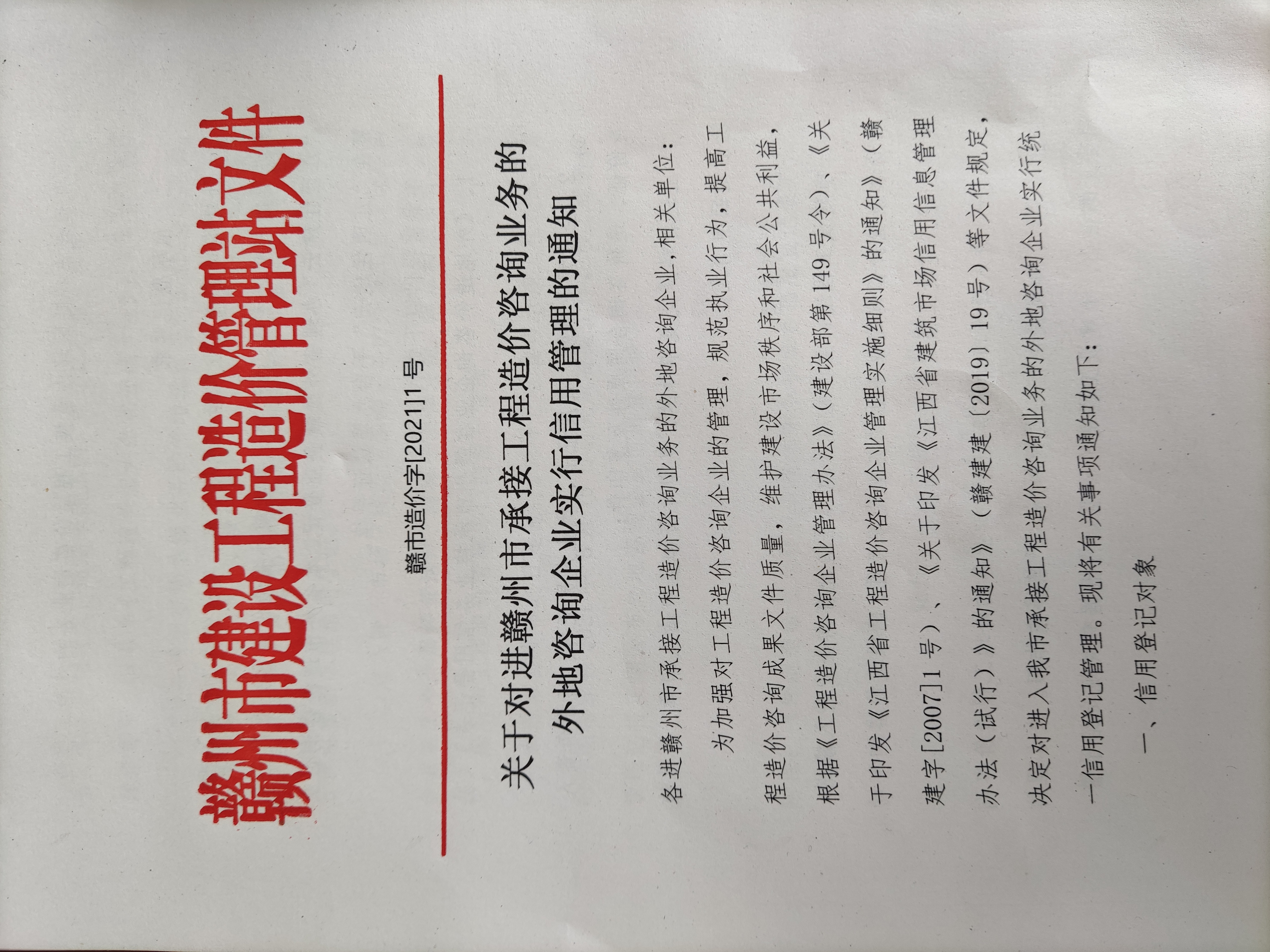 关于对进赣州市承接业务工程造价咨询业务的外地咨询企业实行信用管理的通知