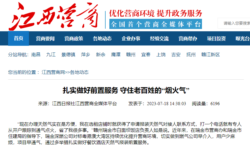 “现在办理天然气实在是方便,我在选租店铺时就获得了申请报装天然气对接人联系方式,打一个电话就有专人从开户跟踪到通气点火,省了我很多事。”赣州瑞金市白面坝饭店负责人如是说。近年来,在瑞金市营商办和瑞金市住建局的指导下,瑞金深燃公司对标粤港澳大湾区持续优化提升营商环境,切实做到燃气公司早介入,用户少麻烦,项目早通气,通过多举措扎实做好餐饮酒店天然气报装前置服务。