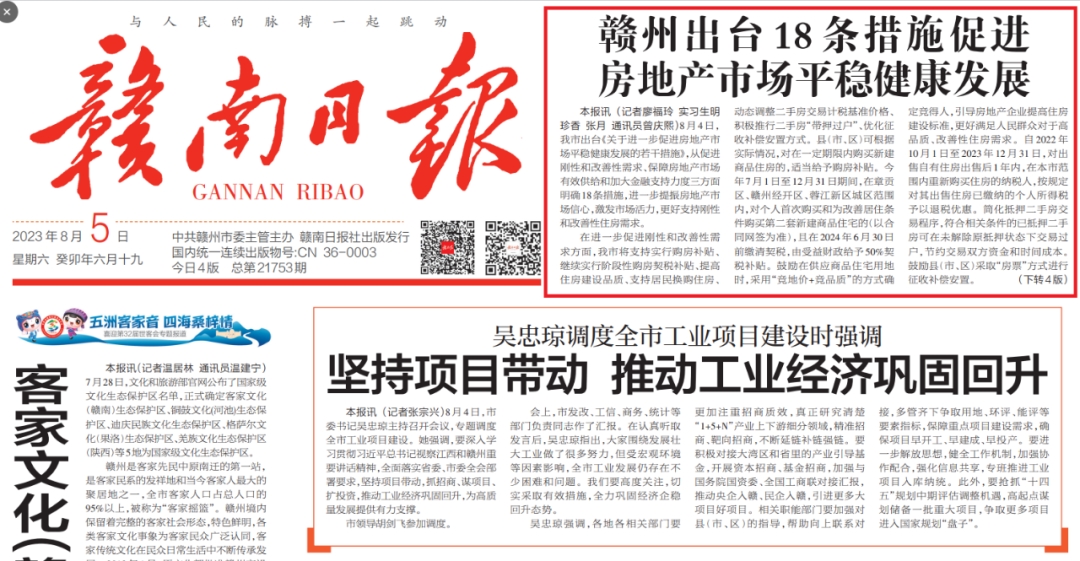 8月4日,赣南日报刊发《赣州出台18条措施促进房地产市场平稳健康发展》。