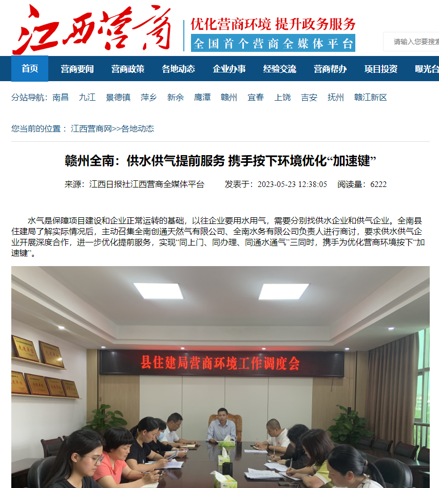 江西营商点赞:赣州全南供水供气提前服务 携手按下环境优化“加速键”