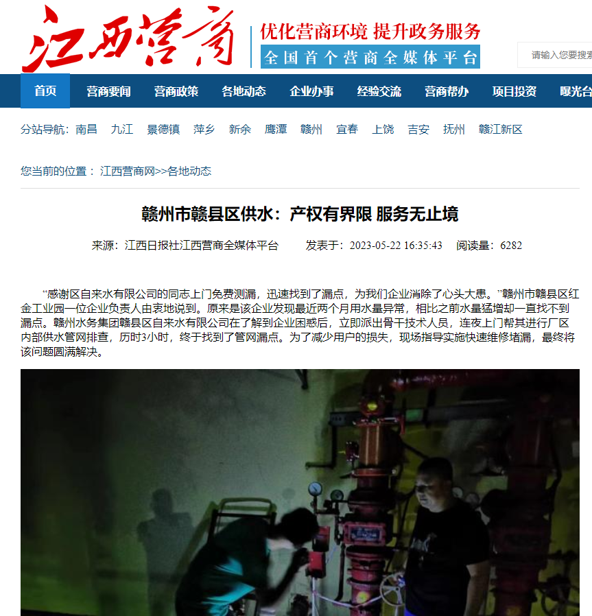 “感谢区自来水有限公司的同志上门免费测漏,迅速找到了漏点,为我们企业消除了心头大患。”赣州市赣县区红金工业园一位企业负责人由衷地说到。原来是该企业发现最近两个月用水量异常,相比之前水量猛增却一直找不到漏点。赣州水务集团赣县区自来水有限公司在了解到企业困惑后,立即派出骨干技术人员,连夜上门帮其进行厂区内部供水管网排查,历时3小时,终于找到了管网漏点。为了减少用户的损失,现场指导实施快速维修堵漏,最终将该问题圆满解决。