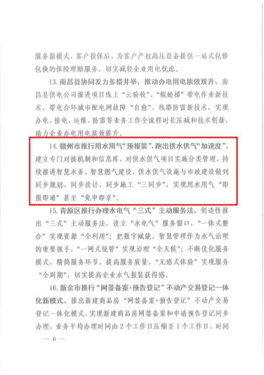 36日,江西省优化营商环境工作领导小组印发《关于通报2023年度江西省优化营商环境优秀案例的通知》,我市推行用水用气“预报装”改革做法获评全省优秀案例并在全省推广。